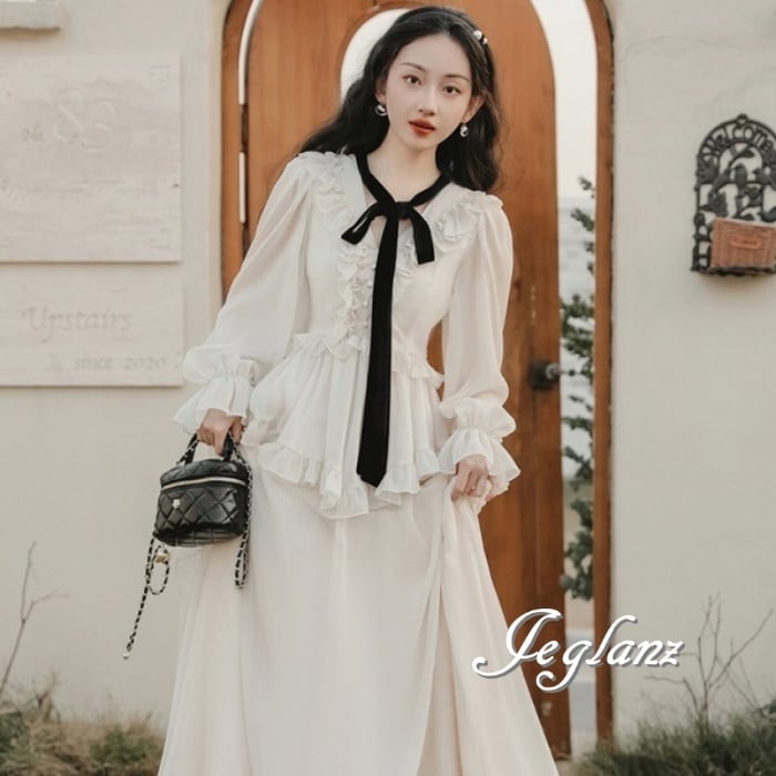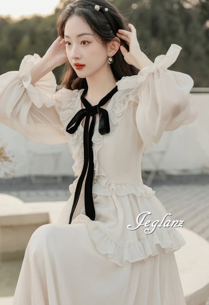 トリムデザインのボタン&フリルが上品で可愛らしい印象