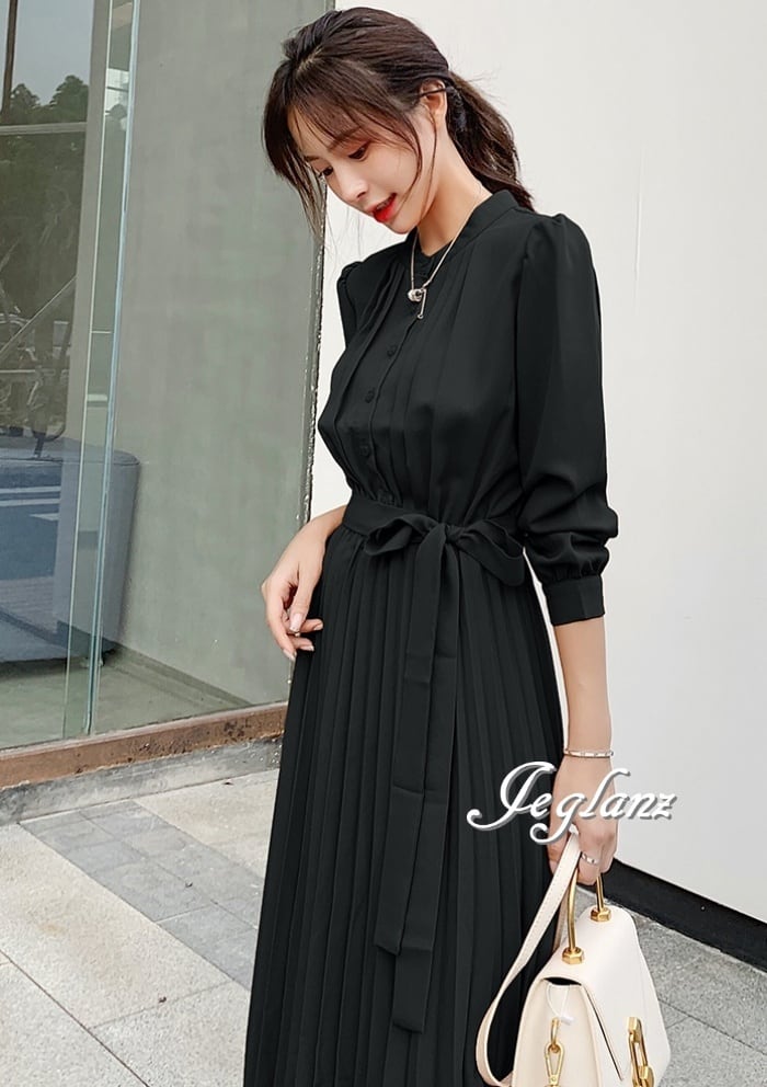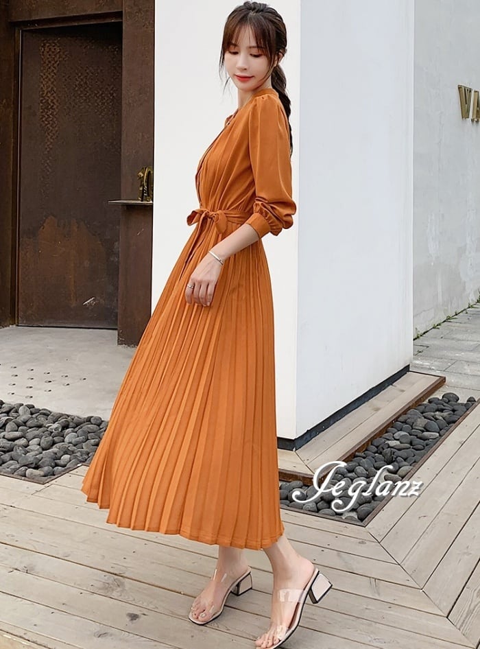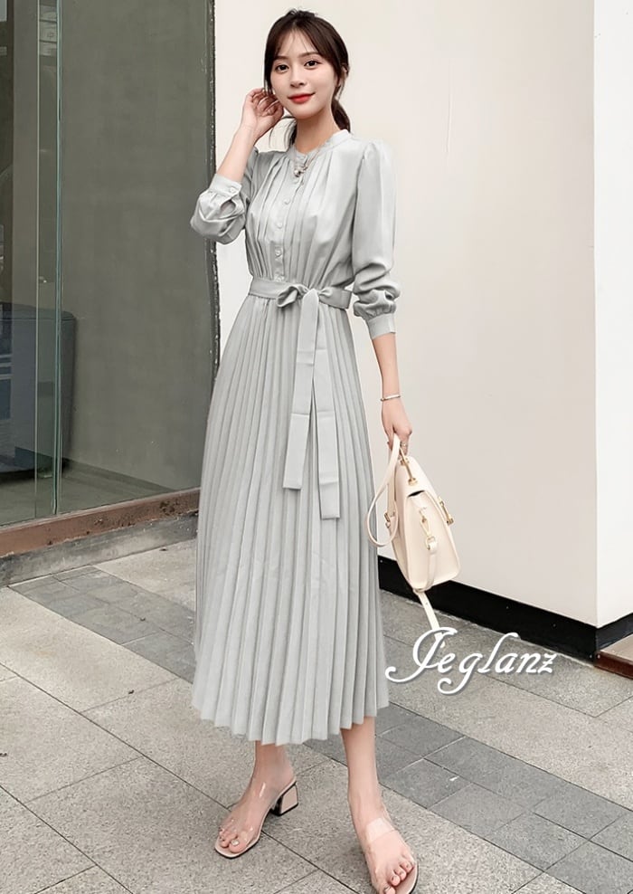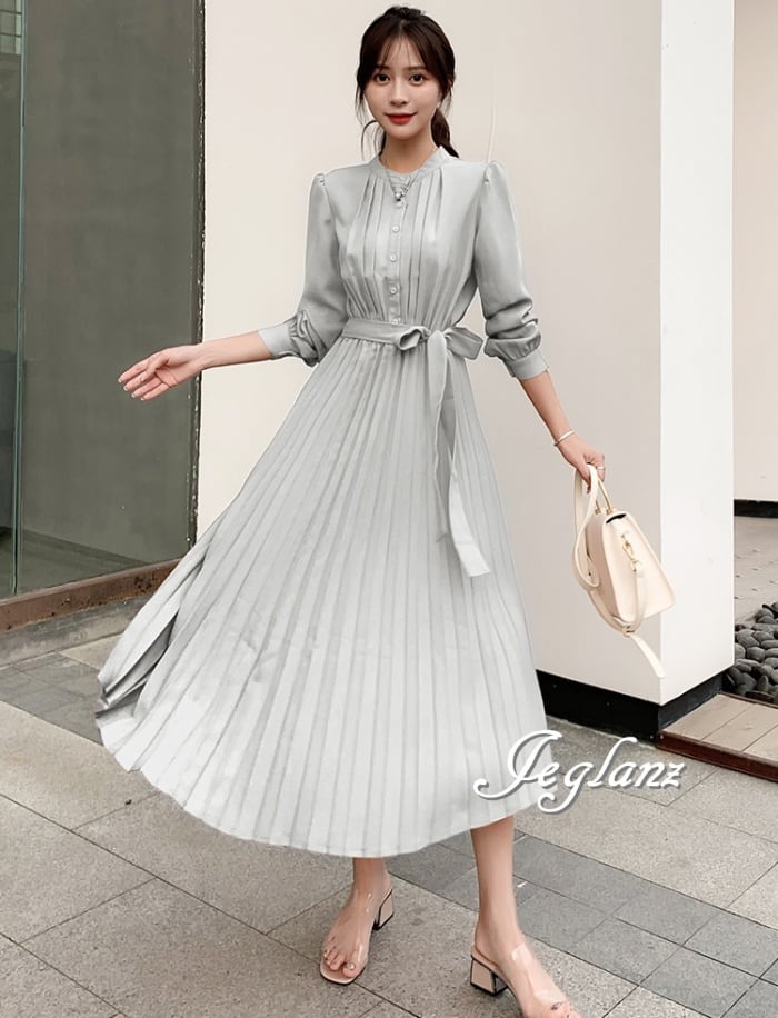 4色 プリーツ ワンピース ドレス 共ベルト Aライン 細見え(M6194)ζ