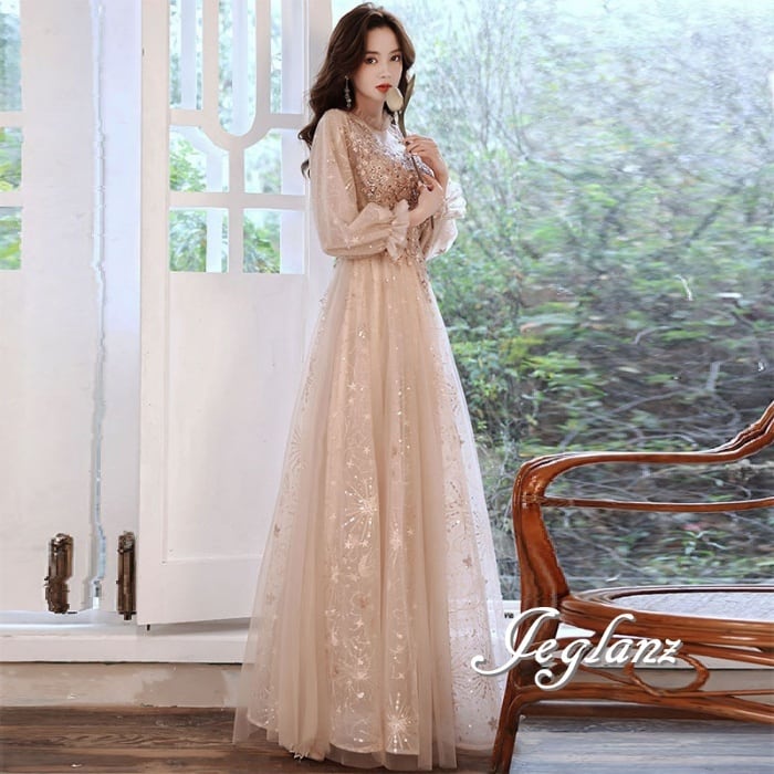 パーティ ドレス シアー 背中 編み上げ ラメ キラキラ 光沢感 ミドル/ロング(M6240)ζ