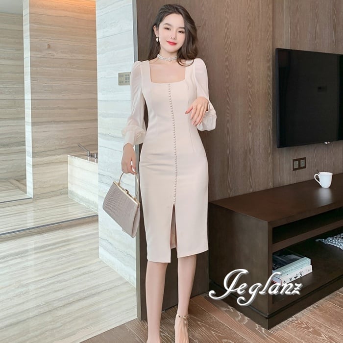 2色 パーティ ドレス ワンピース ボタン スリット入り 肌透け(M6241)ζ