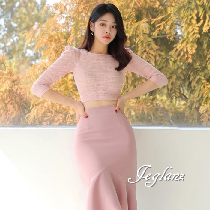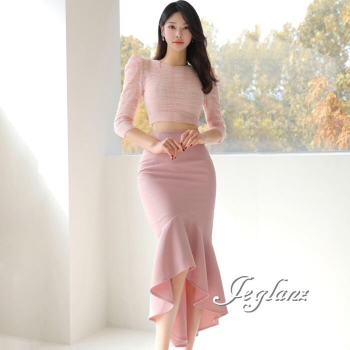 セットアップ 2点 クロップド丈 トップス 7分袖 フィッシュテール 肌見せ (M6435)★