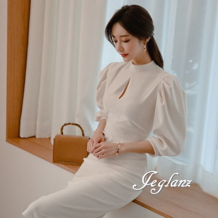 ワンピース ドレス モックネック ボリューム袖 きれいめ タイト 7分袖 (M6545)γ