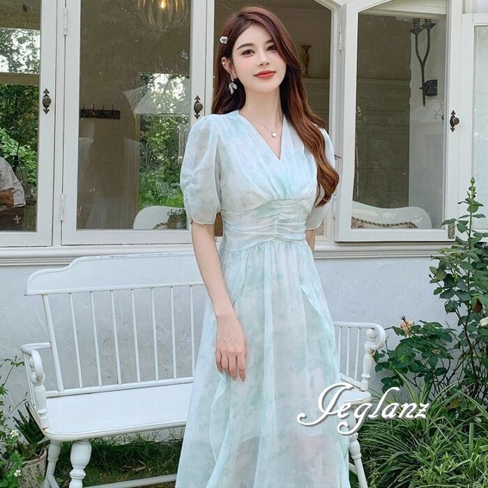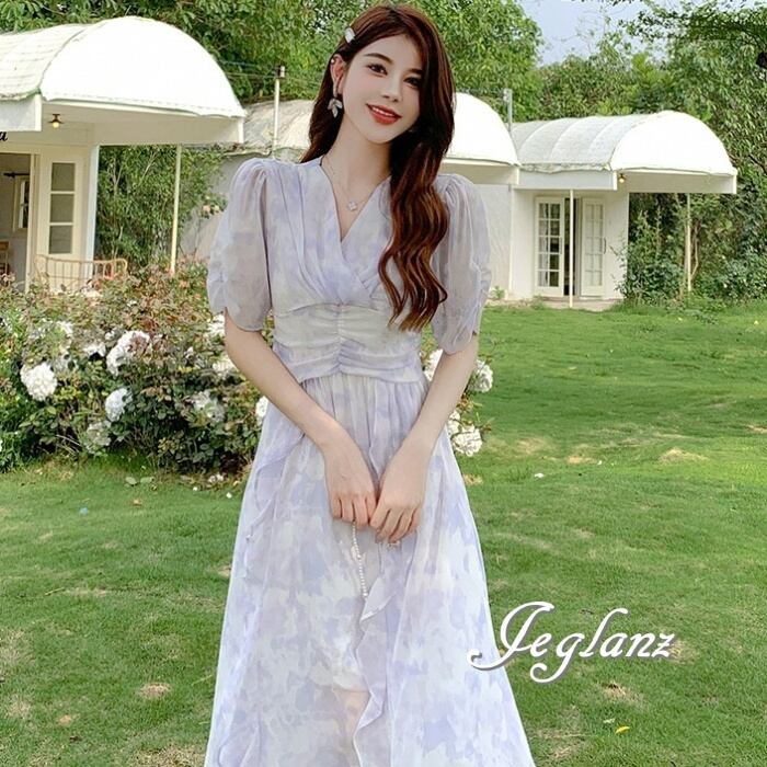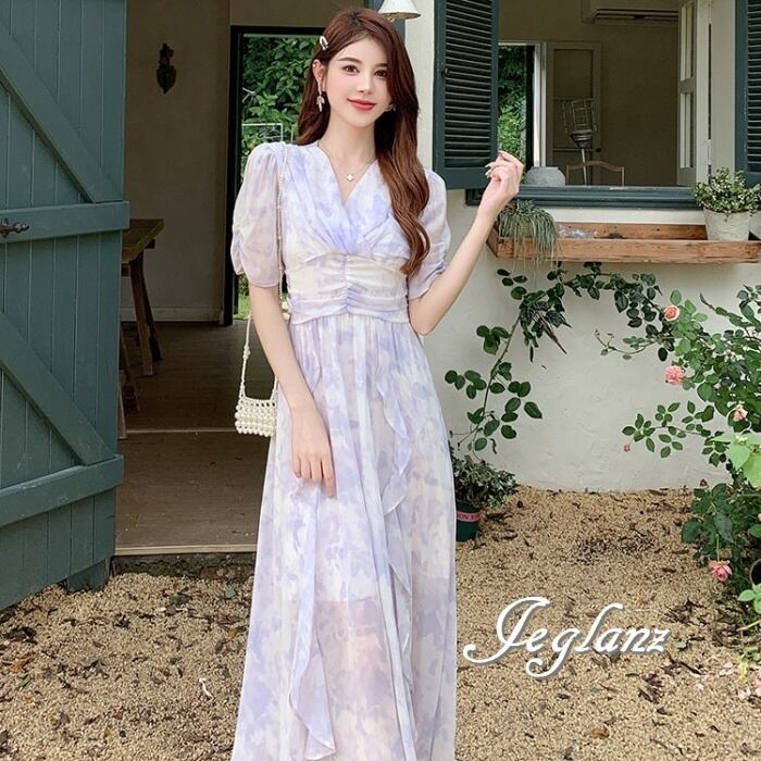 2色 シフォン ワンピース ドレス フリル 肌透け きれいめ 5分袖(M6561)β