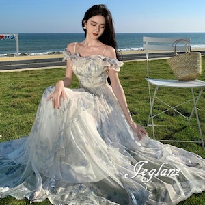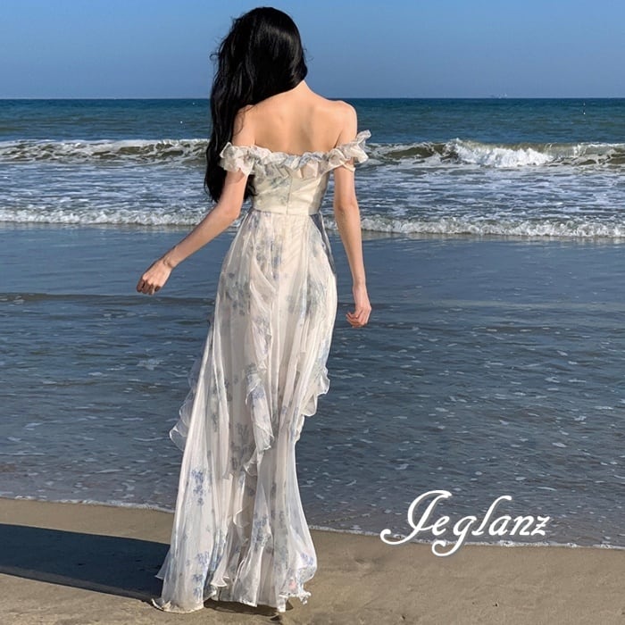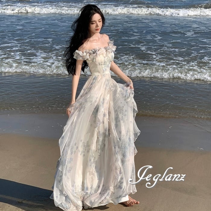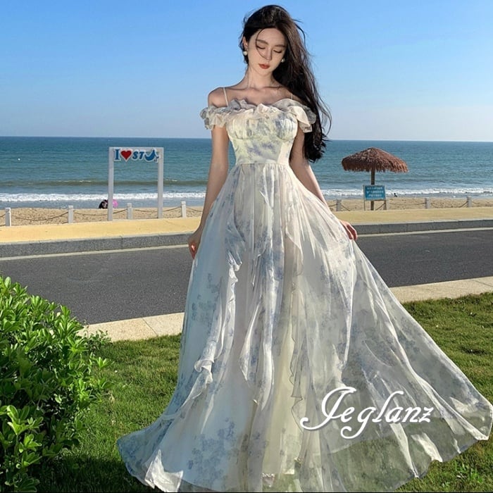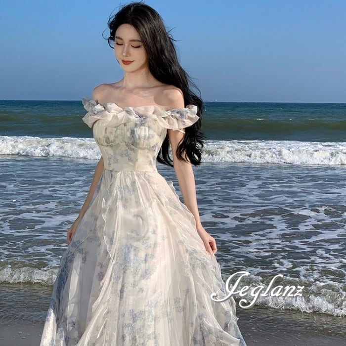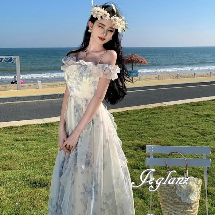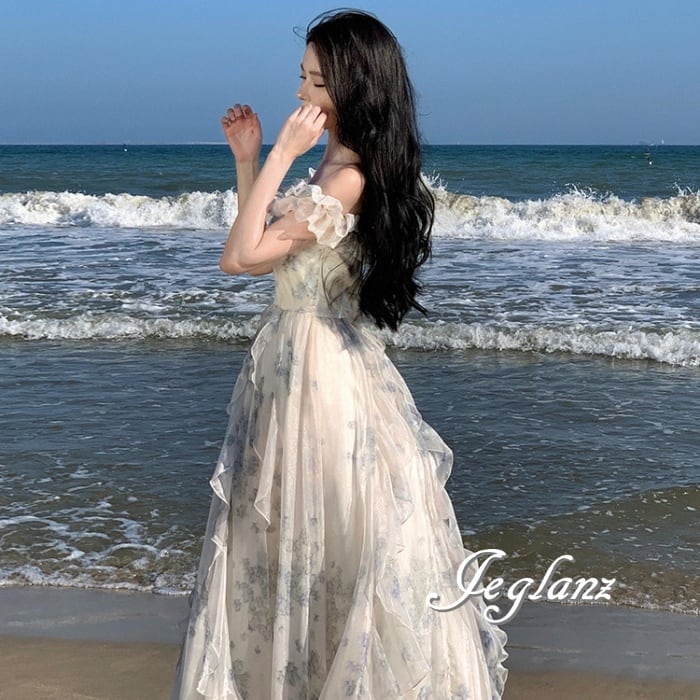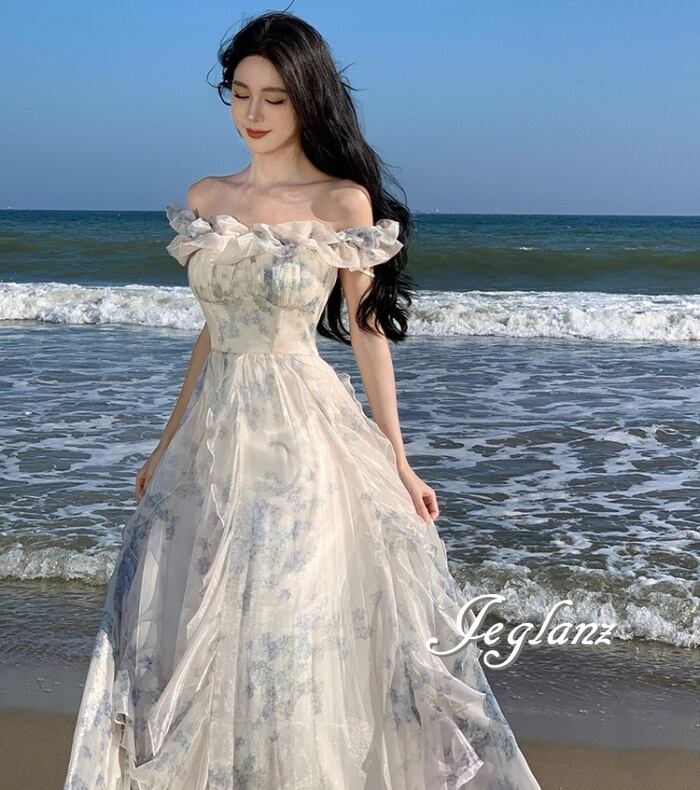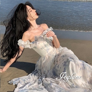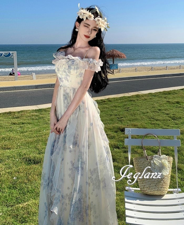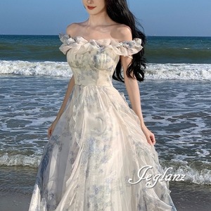 パーティ ドレス 花柄 ワンピース コードショルダー フリルカラー (M6608)ε