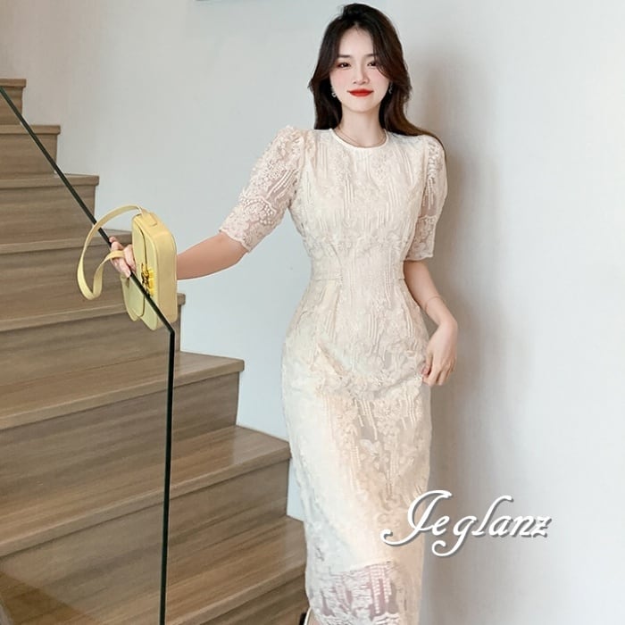 透かし彫り ワンピース ドレス レーシー 透け感 5分袖 エターナル(M6879)ζ