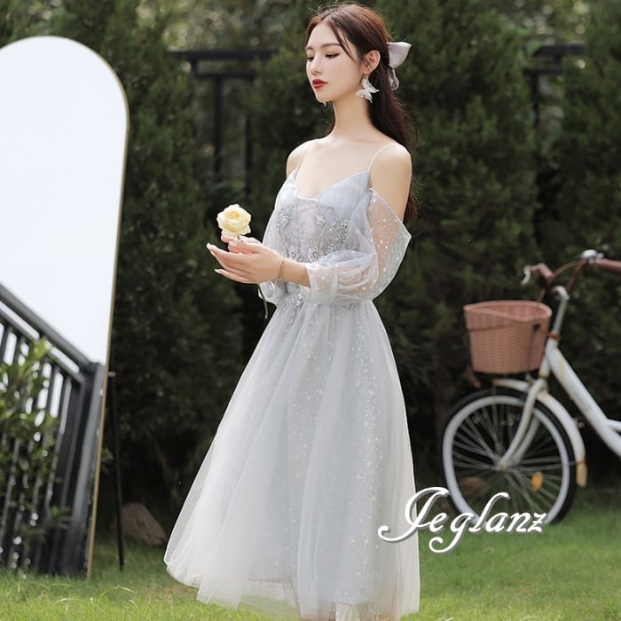 パーティドレス ワンピース ビジュー モチーフ 透け感 4パターン 半袖/長袖(M6914)ζ