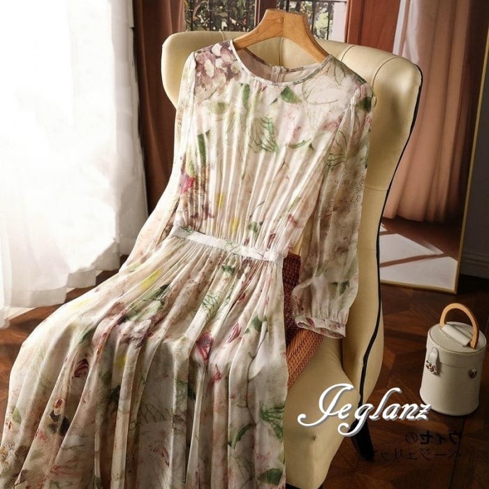 花柄 プリント ワンピース ドレス 透け感 きれいめ 7分袖 エレ派 (M7484)α
