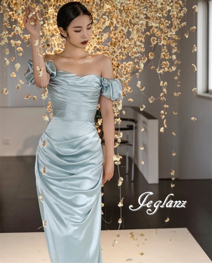 パーティドレス ワンピース ドレープ オフショル ベアトップ スリット入り(M7490)ζ