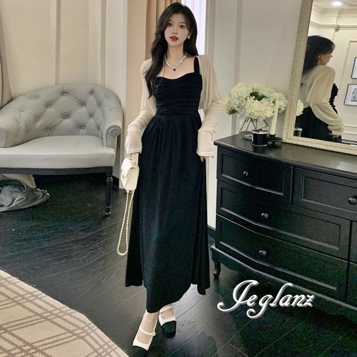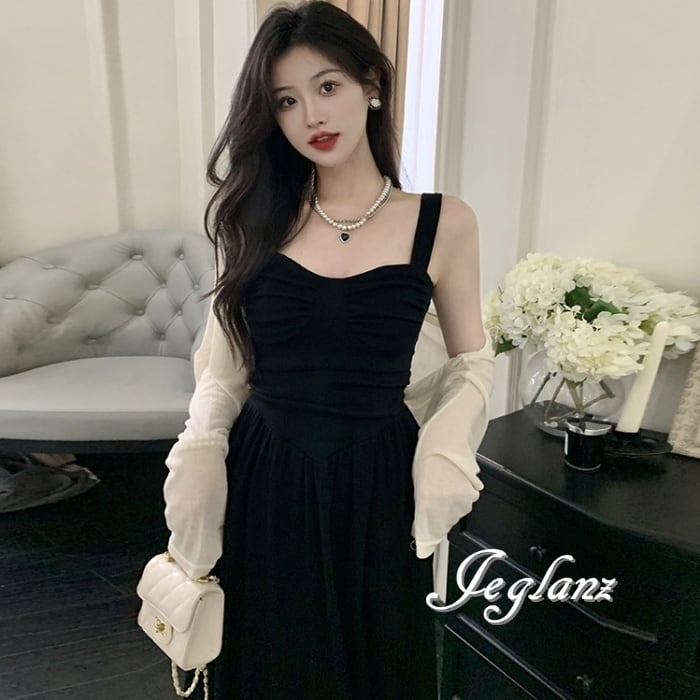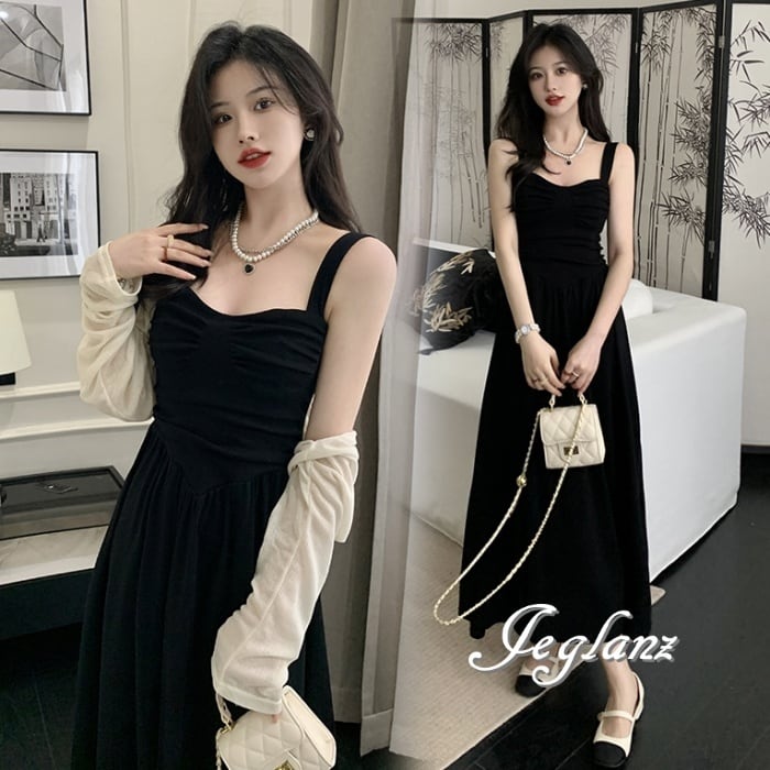 パーティ ブラックドレス ロング キャミワンピース 太ストラップ(M7558)ζ