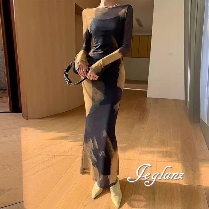ロング丈 プリント ワンピース 透け感 タイト アンダードレス付き (M7575)η