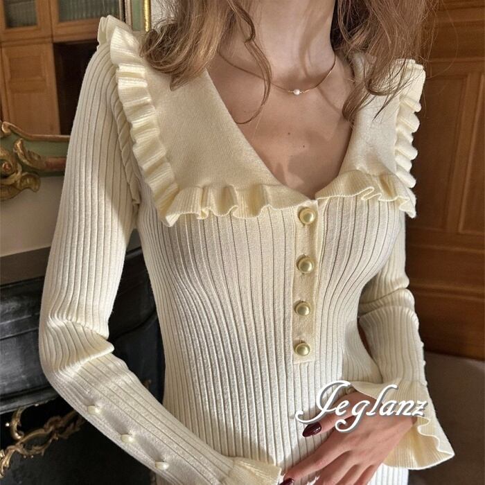 2色 ニット ワンピース ドレス 襟付き パール フリル フェミニン ♪(M7613)γ