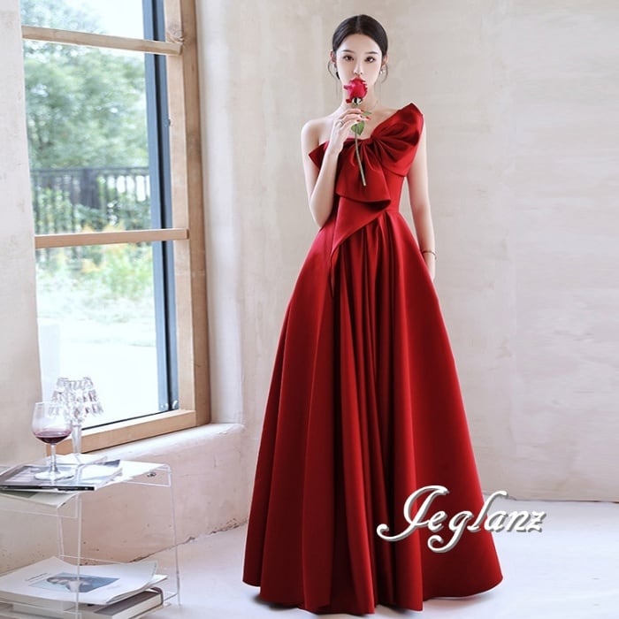 2色 サテン イブニングドレス ワンショル リボン 背中 編み上げ 光沢感(M7668)π
