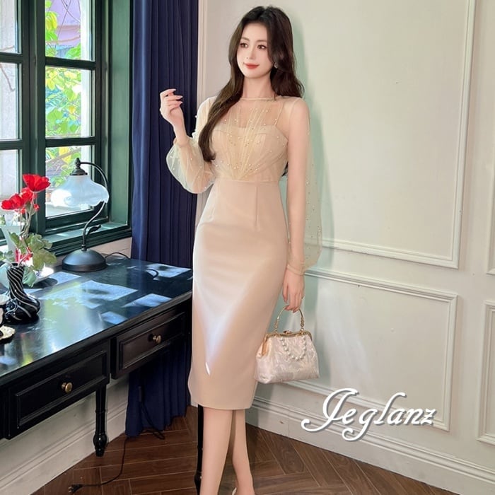 2色 パーティドレス ワンピース パール付き 大人シック ♪(M7733)ζ