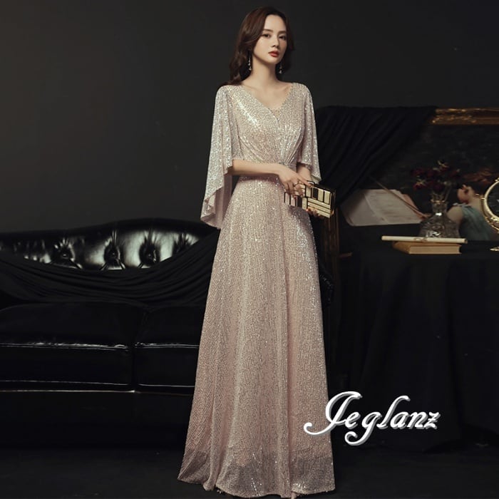 2色 パーティ イブニングドレス ボリューム袖 透け感 ラメ 光沢感 ♪(M7761)ζ