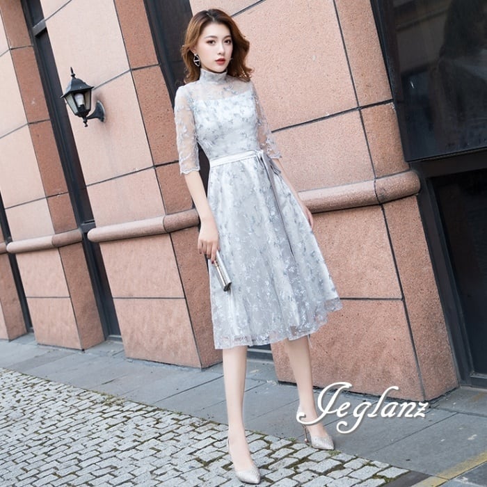 6色 パーティ ドレス ワンピース レーシー 透け感 モックネック 7分袖 (M7811)ζ