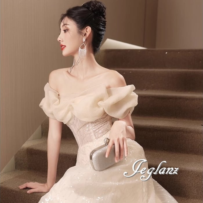 パーティ イブニング ドレス オフショル 背中 編み上げ ラメ 光沢感 ♪(M7986)ζ