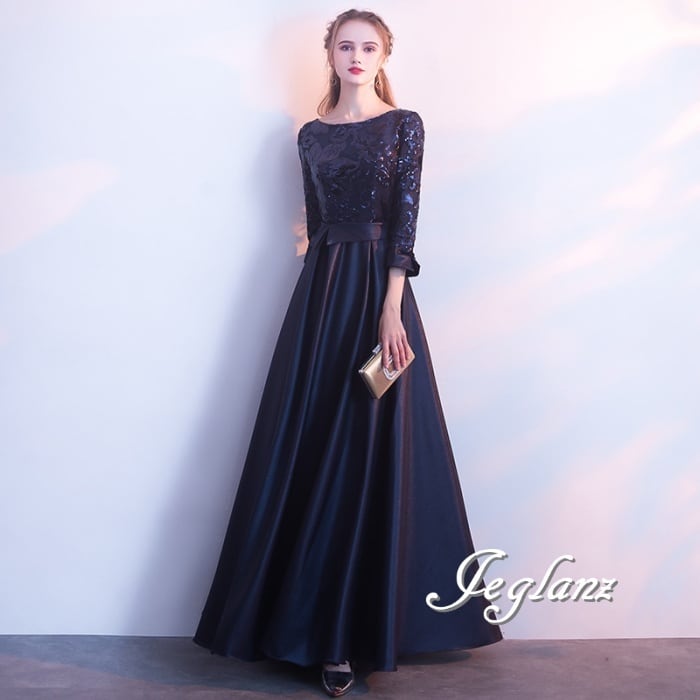 6色 パーティ ドレス ワンピース 切替 ビジュー 7分袖 ロング/イブニング(M7989)ζ