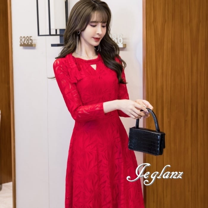 2色 透かし彫り ワンピース ドレス 総レース 肩リボン エターナル 7分袖 ♪(M8067)ζ