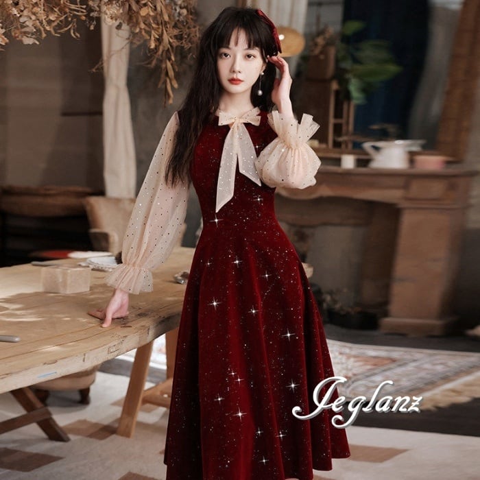 ボウタイデザインが上品なフェミニンなワンピースドレス