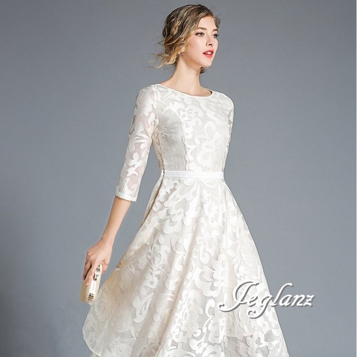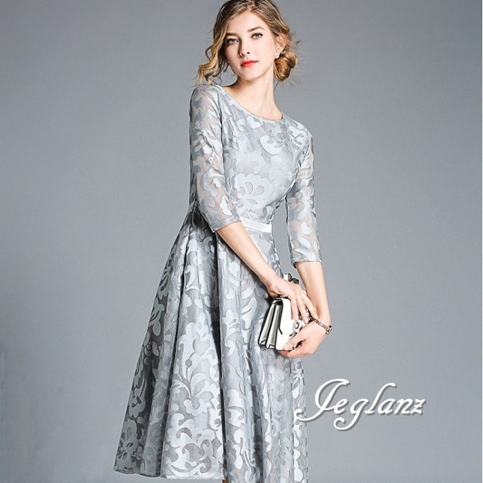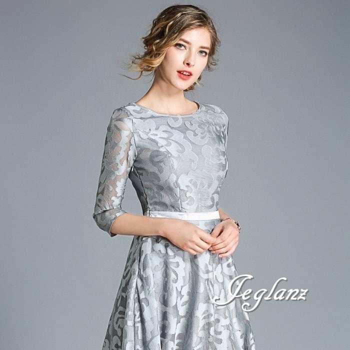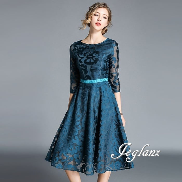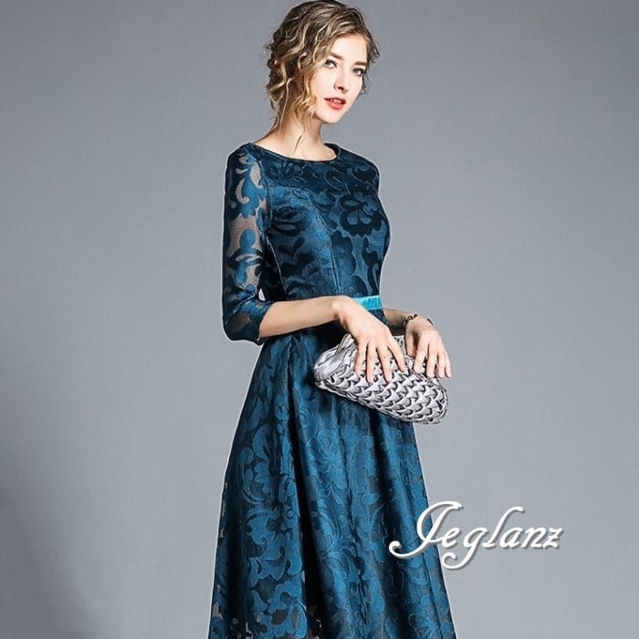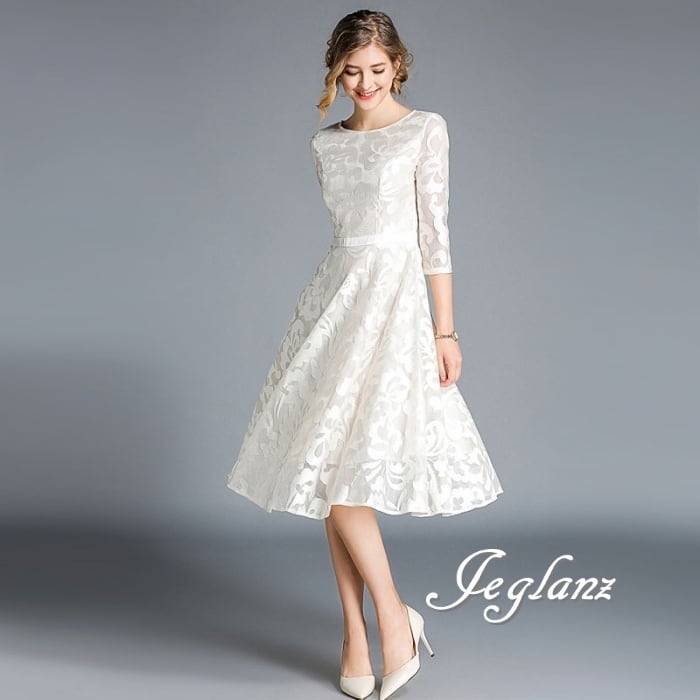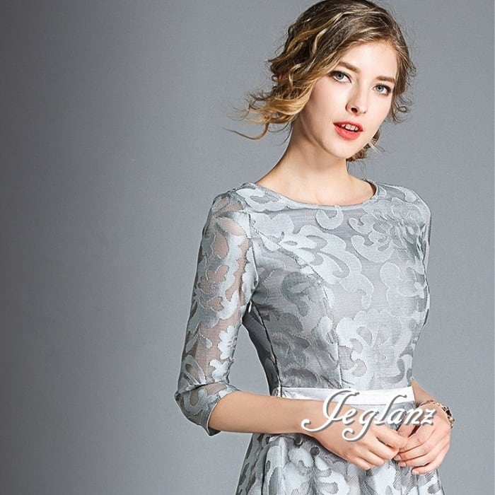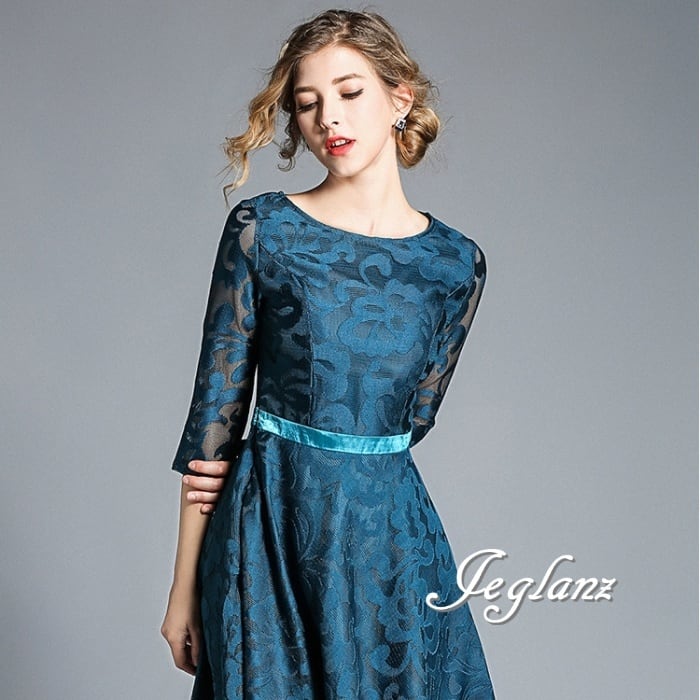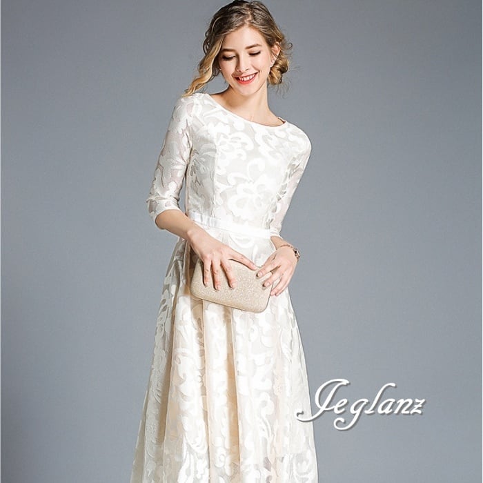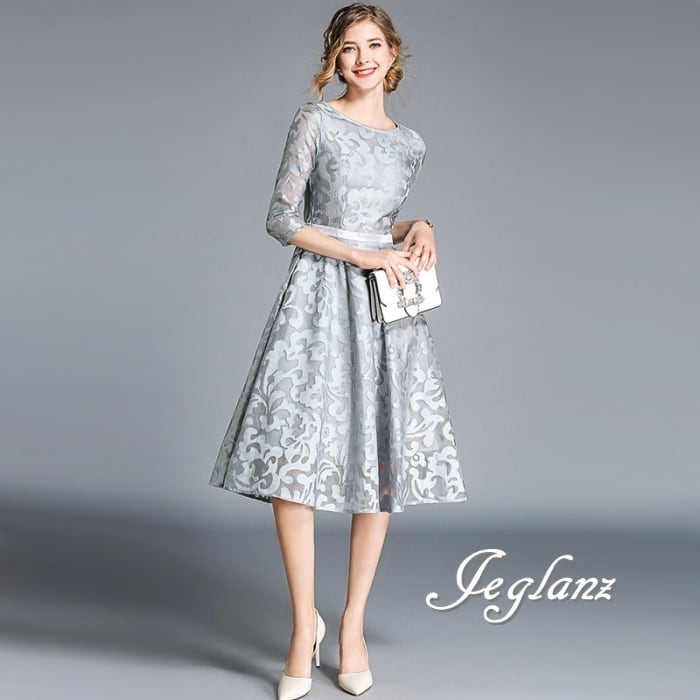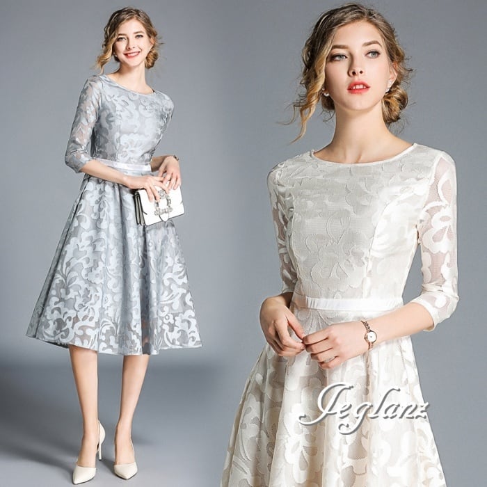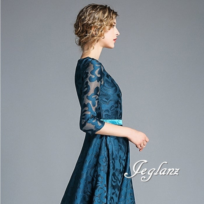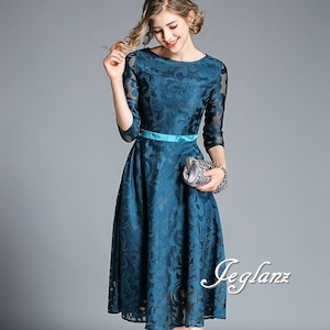 3色 パーティドレス 結婚式 ワンピース モチーフ 透け感 7分袖(M8130)★ ζ☆