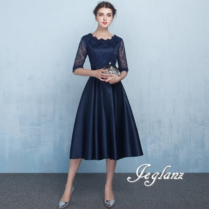 2色 パーティドレス 異素材 レース ワンピース 立体リボン 5分袖(M8210)ζ