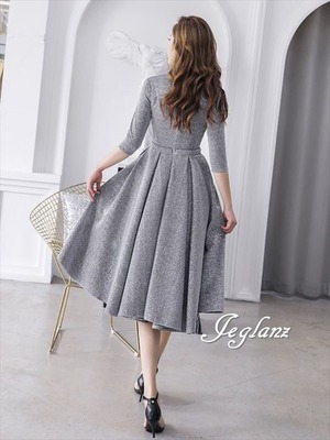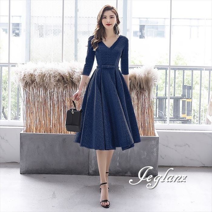 6色 パーティ ドレス ワンピース V開き タック入り ラメ 光沢 エレ派 (M2292)ζ