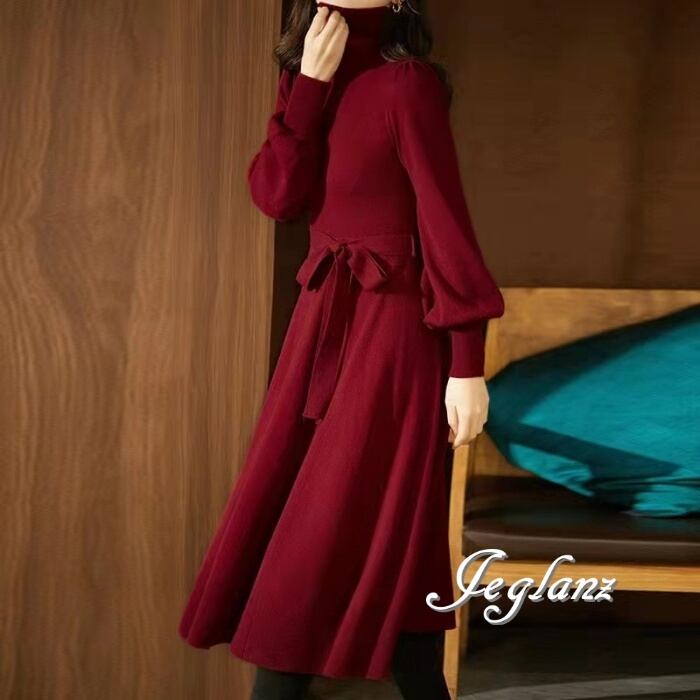 3色 ニット ワンピース モックネック 共ベルト エレ派 ♪(M8294)δ