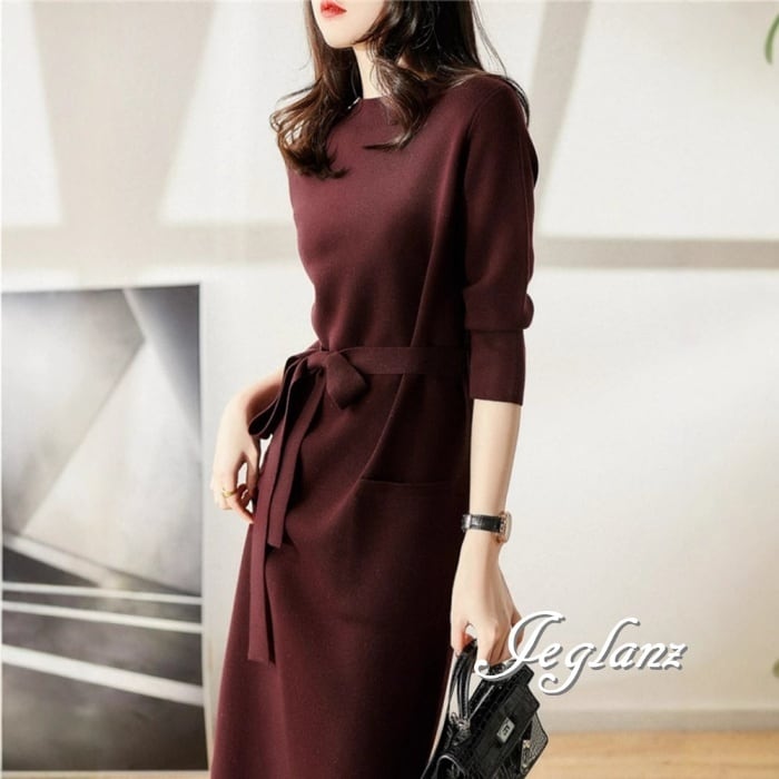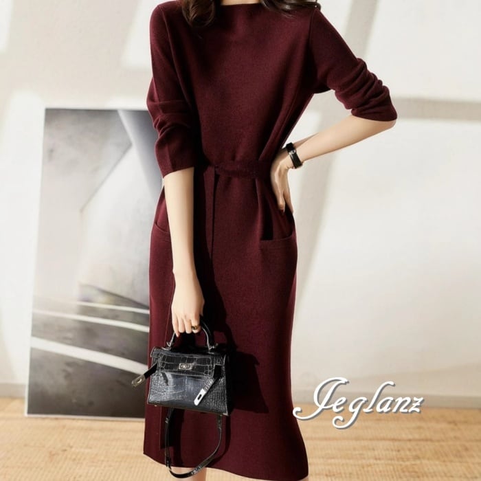 上品 ニット ワンピース ドレス ハイネック 共ベルト きれいめ 3色 (M8398)δ