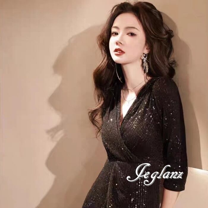 4色 パーティ イブニングドレス ラッフルフリル ラメ 光沢感 7分袖( M8402)ζ