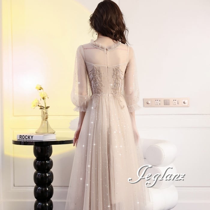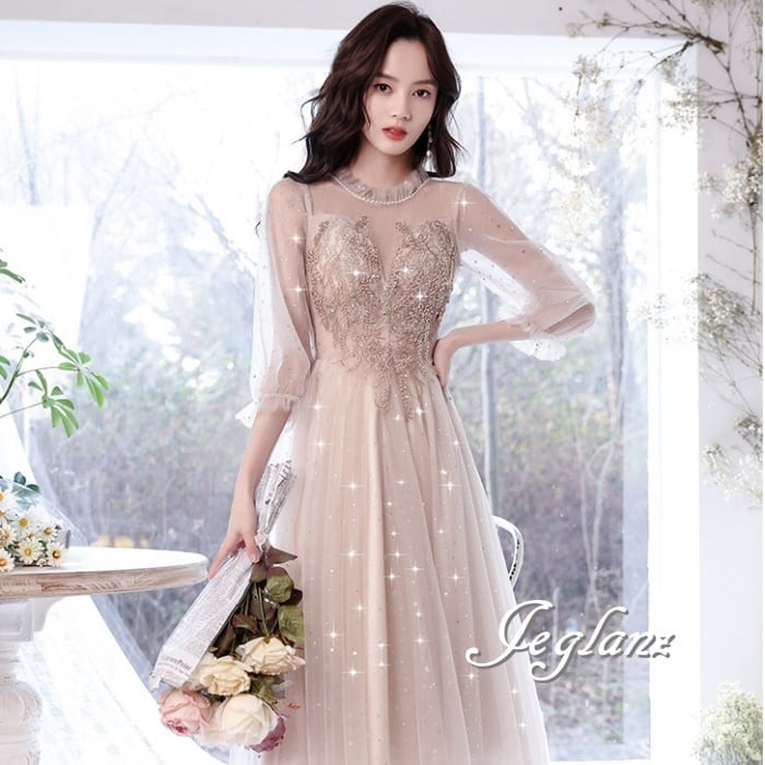 パーティ ドレス チュール 透け感 パール 光沢感 7分袖 ロング/イブニング(M8478)ζ