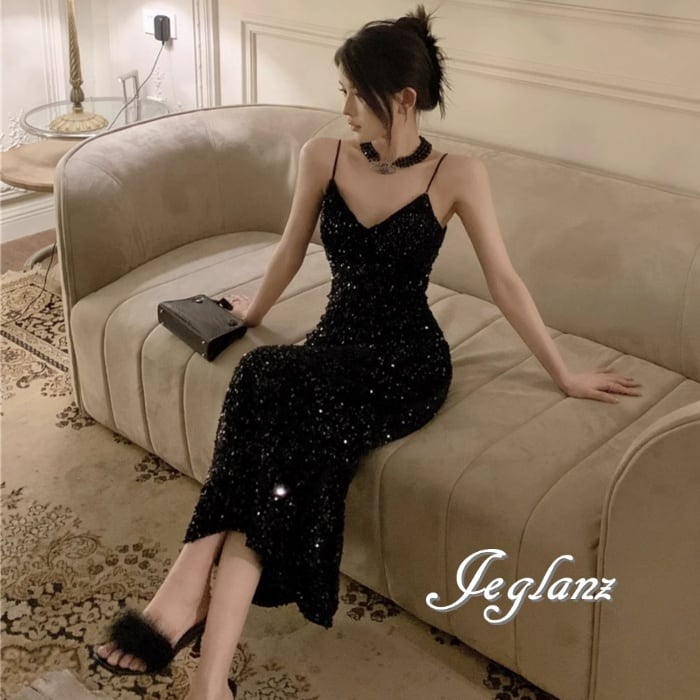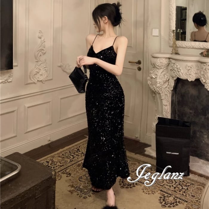 華やか パーティ ドレス キャミワンピース スパンコール 光沢感( M8494)ζ