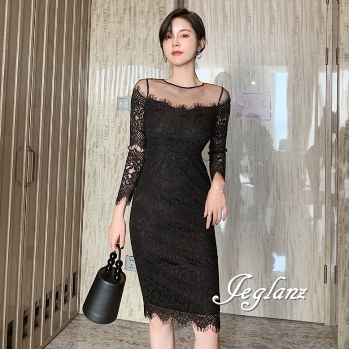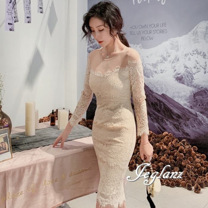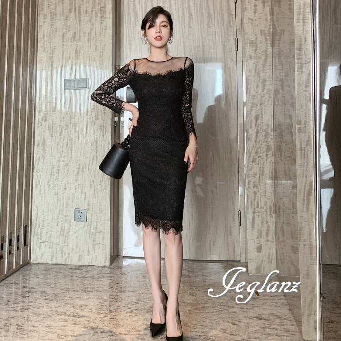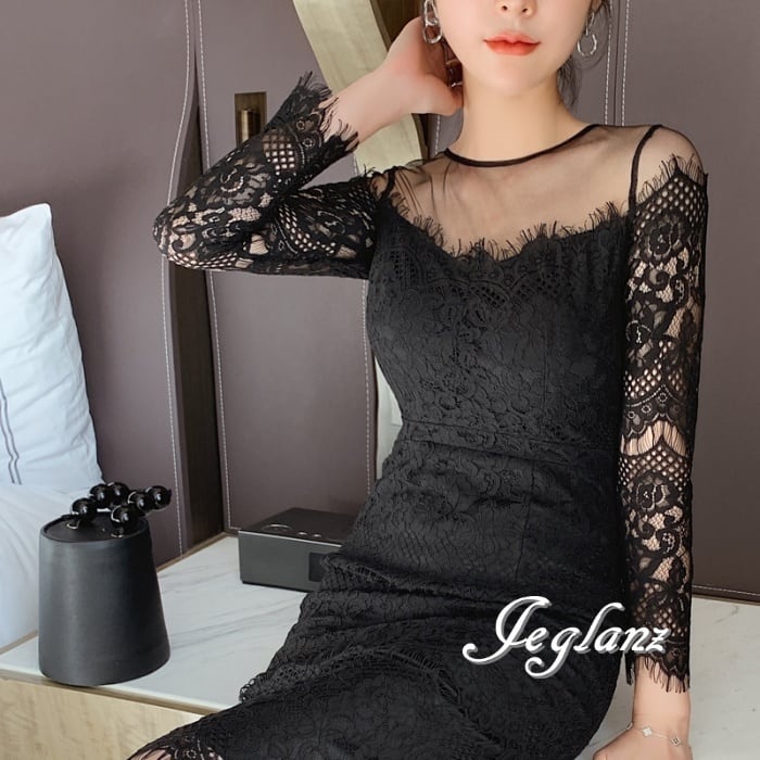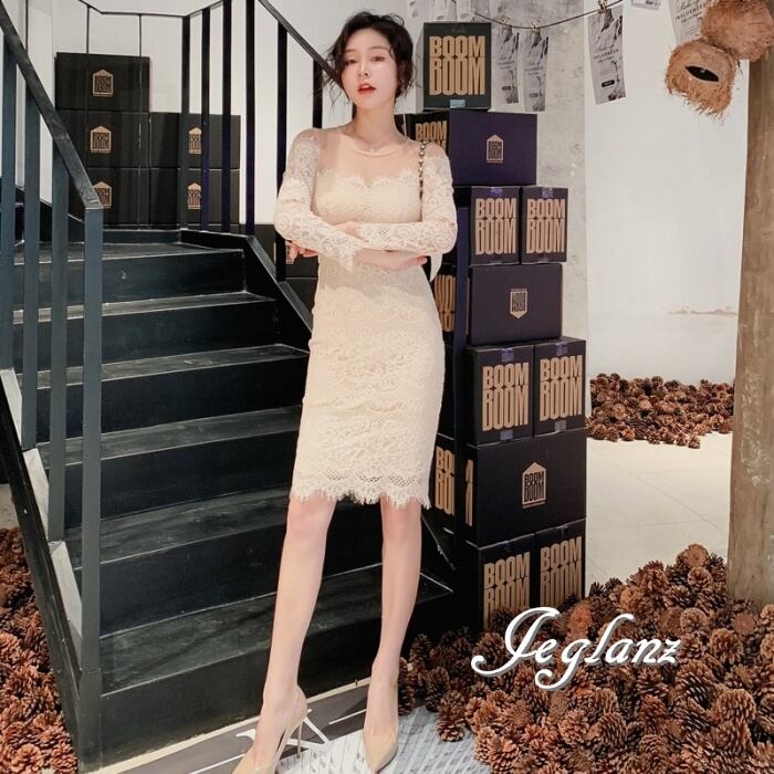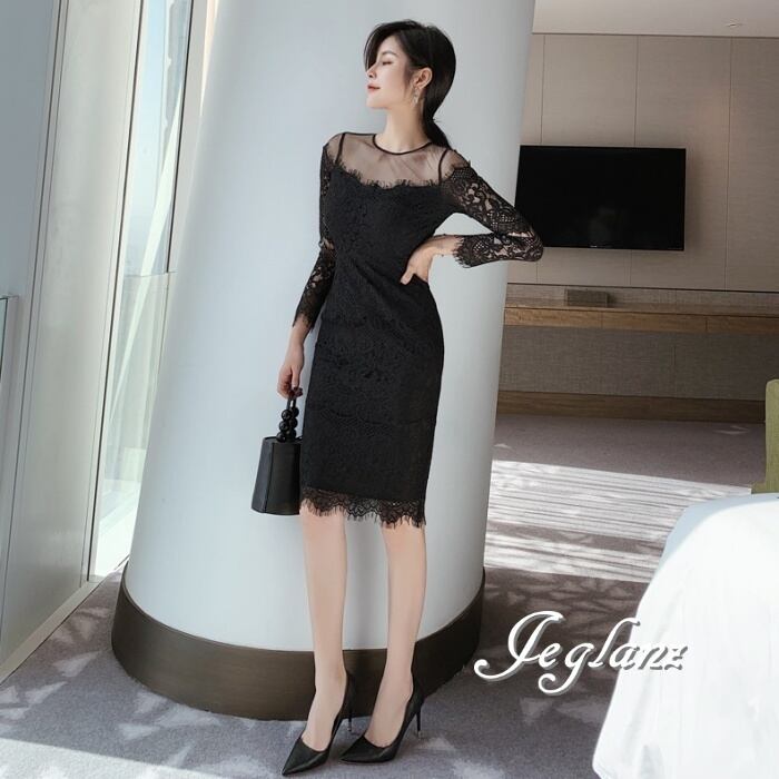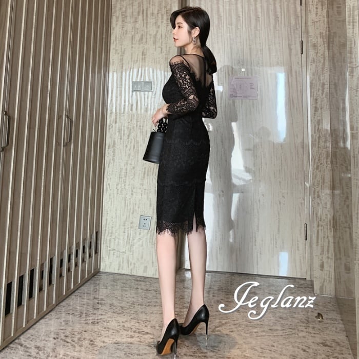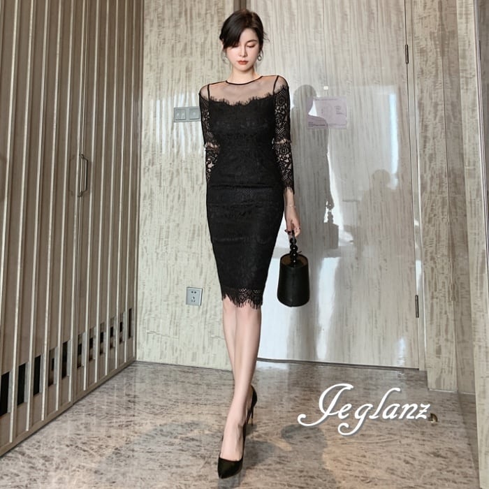 透かし彫り パーティ ドレス ワンピース スカラップ 7分袖 2色 ♪(M8511)ζ