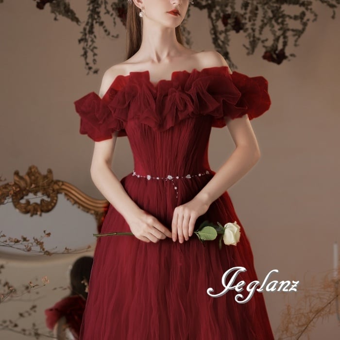 2色 パーティ イブニングドレス オフショル チュール 背中 編み上げ (M8542)ζ
