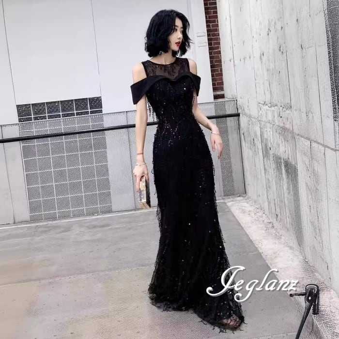 3色 パーティ イブニングドレス オープンショルダー 光沢感 肌見せ(M8609)ζ