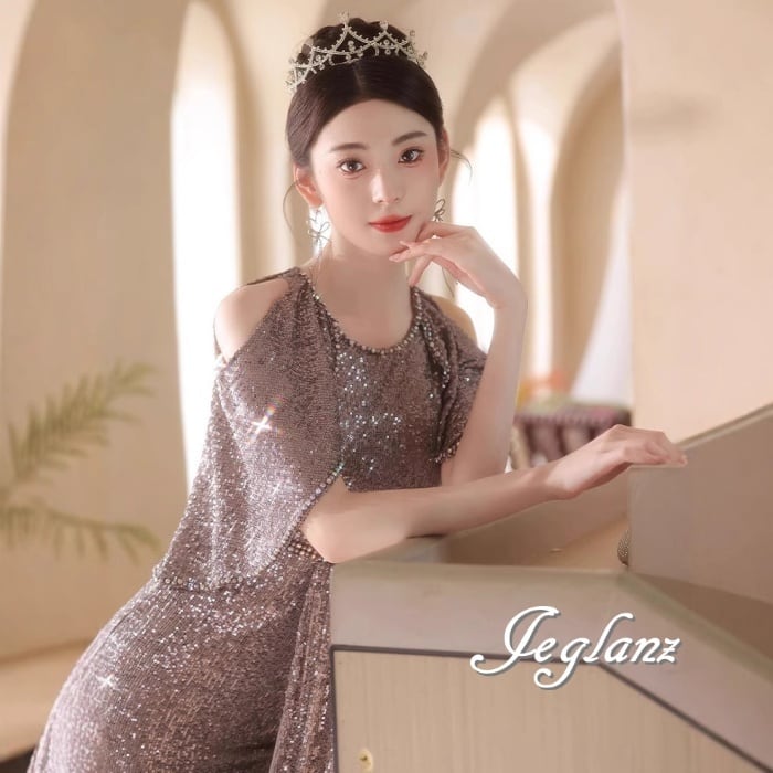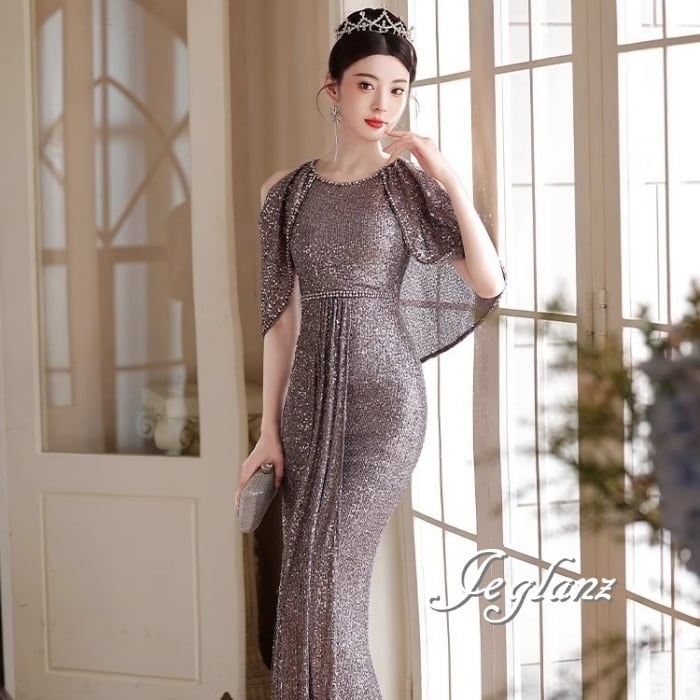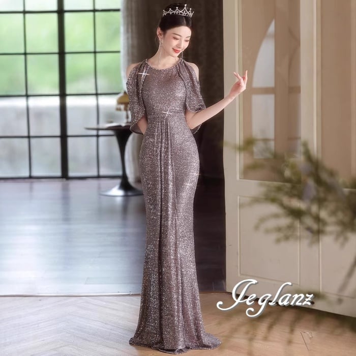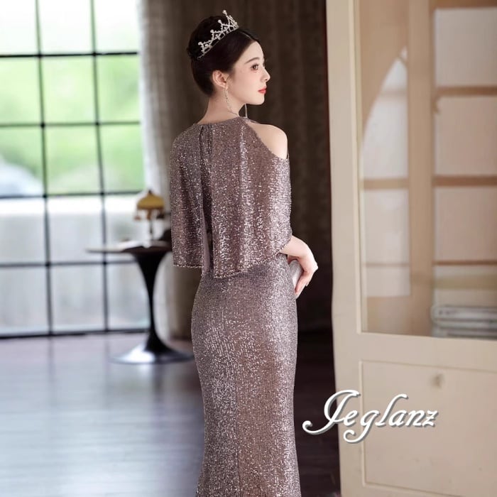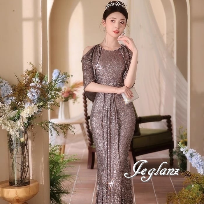 3色 パーティ イブニングドレス オープンショルダー 光沢感 肌見せ(M8621)ζ☆