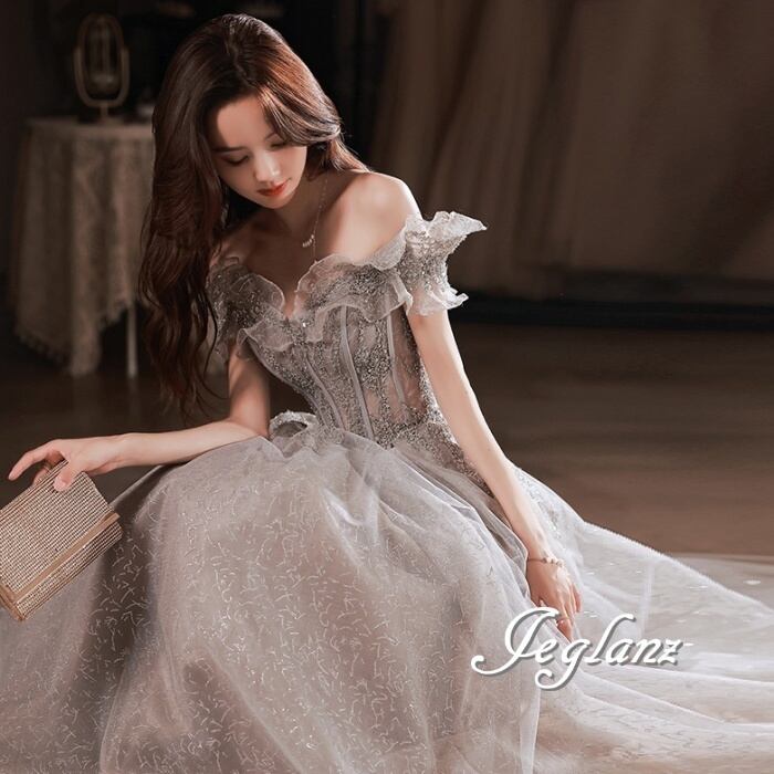 パーティ イブニングドレス 背中 編み上げ オフショル ラメ 光沢感(M8635)ε