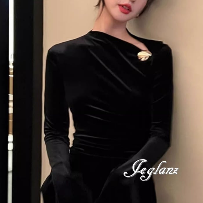 パーティ ベルベット調 マキシ丈 ワンピース ドレス ベルスリーブ(M8641)η