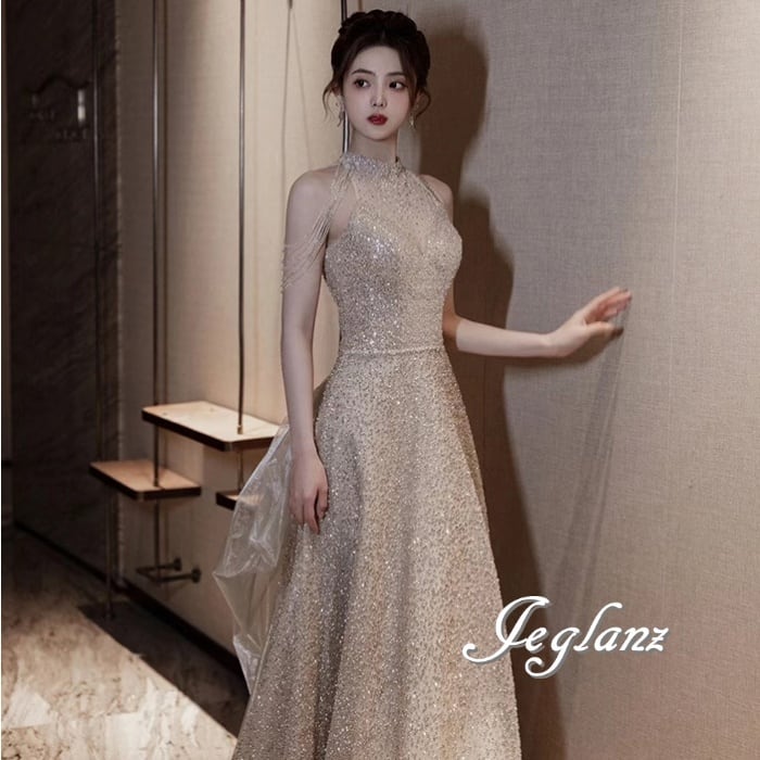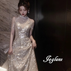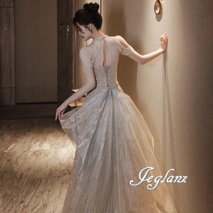 華やか パーティ イブニングドレス 背中 編み上げ バックシャン 光沢感(M8653)ζ