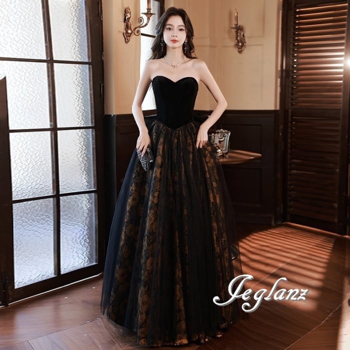パーティ イブニングドレス ベアトップ 編み上げ 背中 リボン 肌見せ(M8654)ε