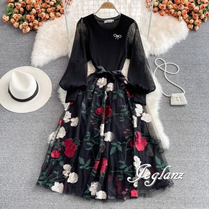 儚げなレースにバラの刺繍を施したドラマティックなドレス