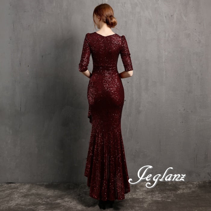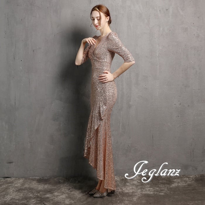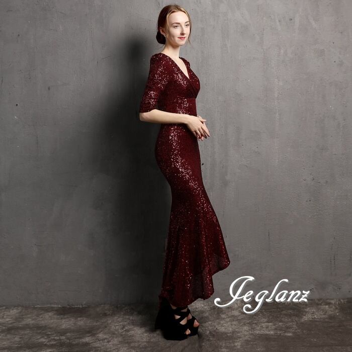 華やか パーティ ドレス ワンピース スパンコール 光沢感 7分袖 4色(M8749)ζ