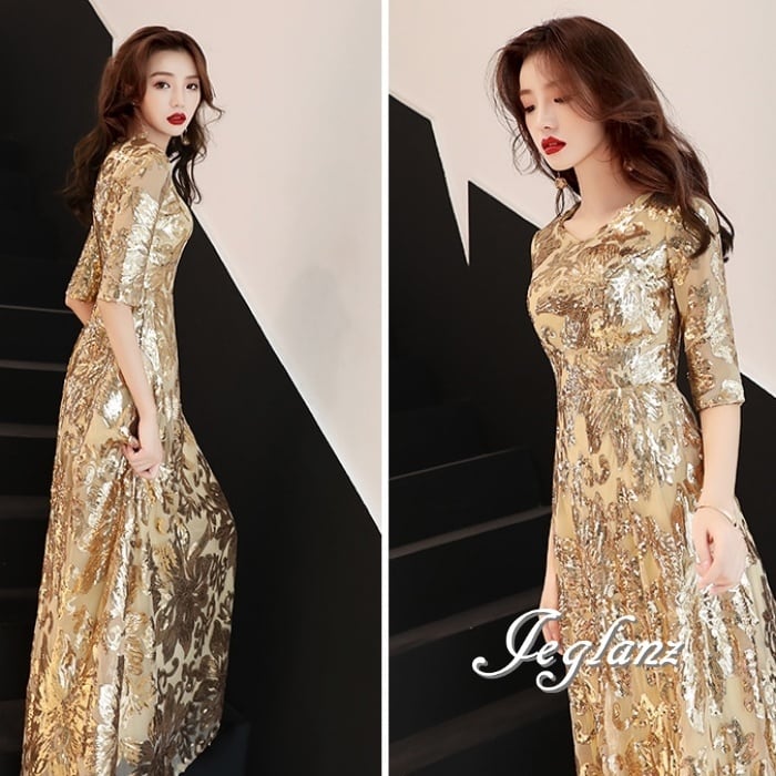 3色 美ライン パーティ イブニングドレス スパンコール 光沢感 5分袖 ♪(M8769)ζ