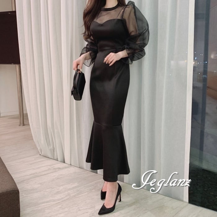 パーティ ドレス ワンピース 異素材 レース 透け感 マーメイド ♪(M8831)ζ
