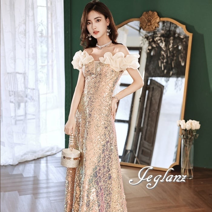 華やか イブニングドレス 背中 編み上げ フリル スパンコール 光沢感(M8864)ζ