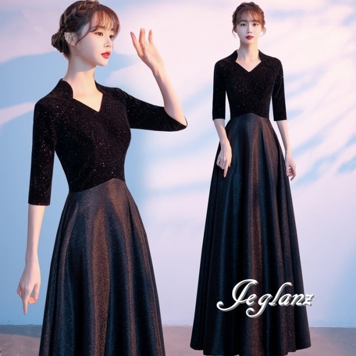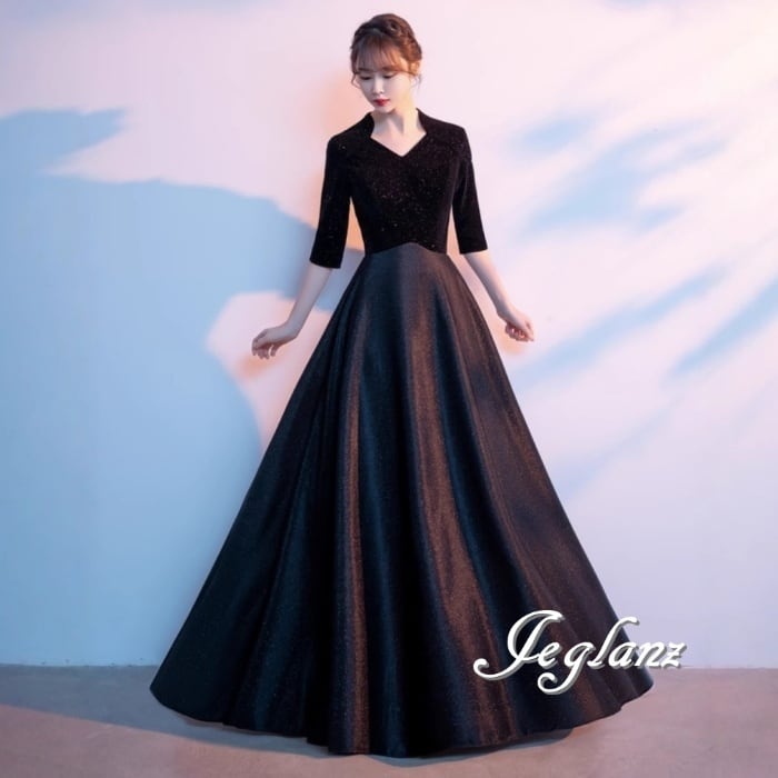 美ライン イブニングドレス ブラックドレス ベルベット調 5分袖( M8875)ζ