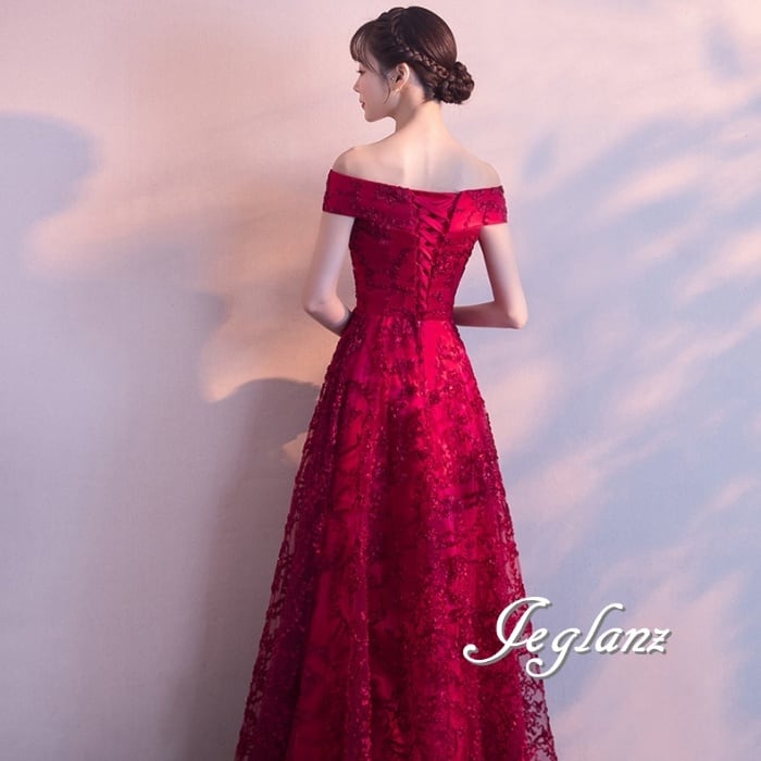 4色 パーティ イブニングドレス 背中 編み上げ オフショル チュール(M8877)ζ