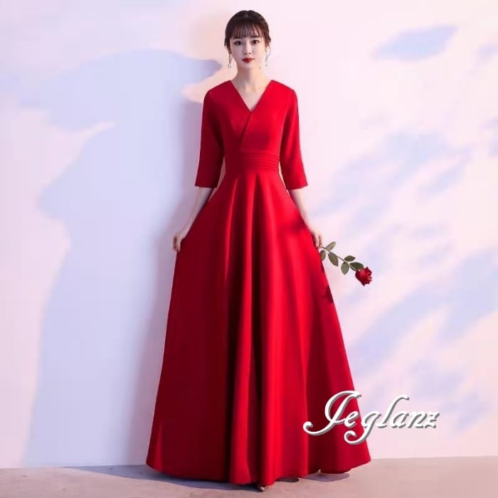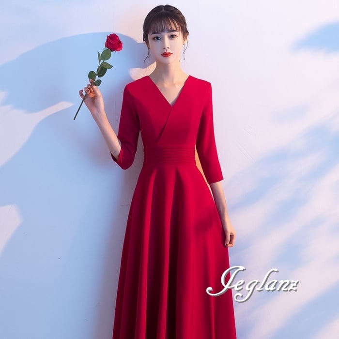 美ライン パーティ イブニングドレス Vネック 7分袖 上品 2色 ♪ (M8919)ζ