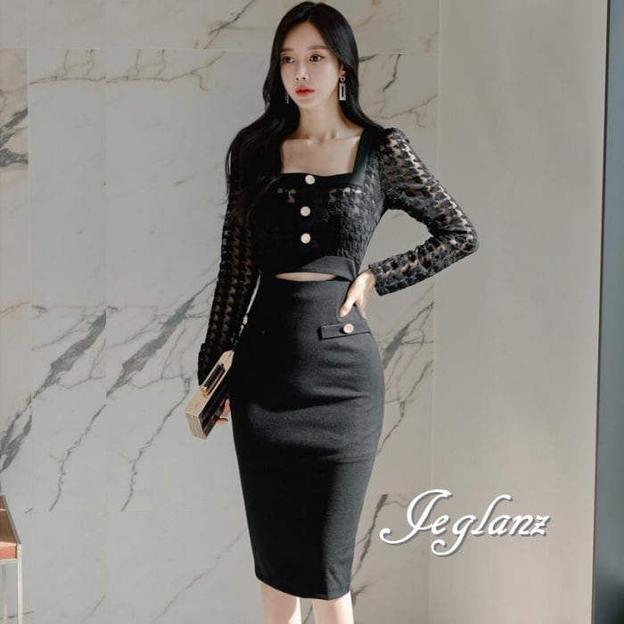 パーティ ドレス ワンピース 異素材 レース カットアウト タイト 肌見せ(M8938)ζ