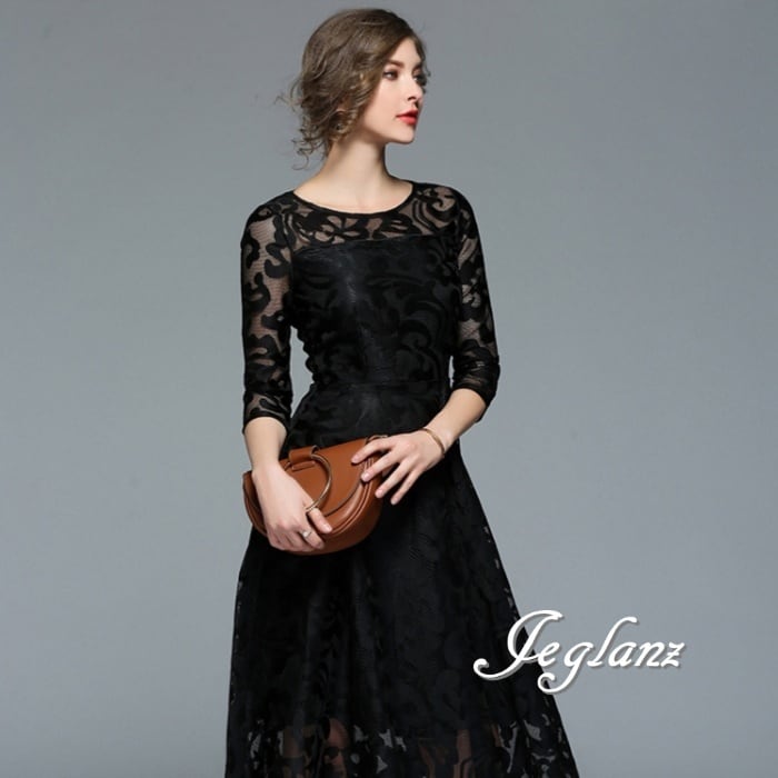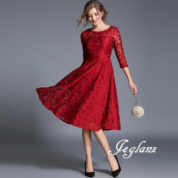 3色 パーティ ドレス レース 刺繍 ワンピース 透け感 7分袖(M8994)★ ζ