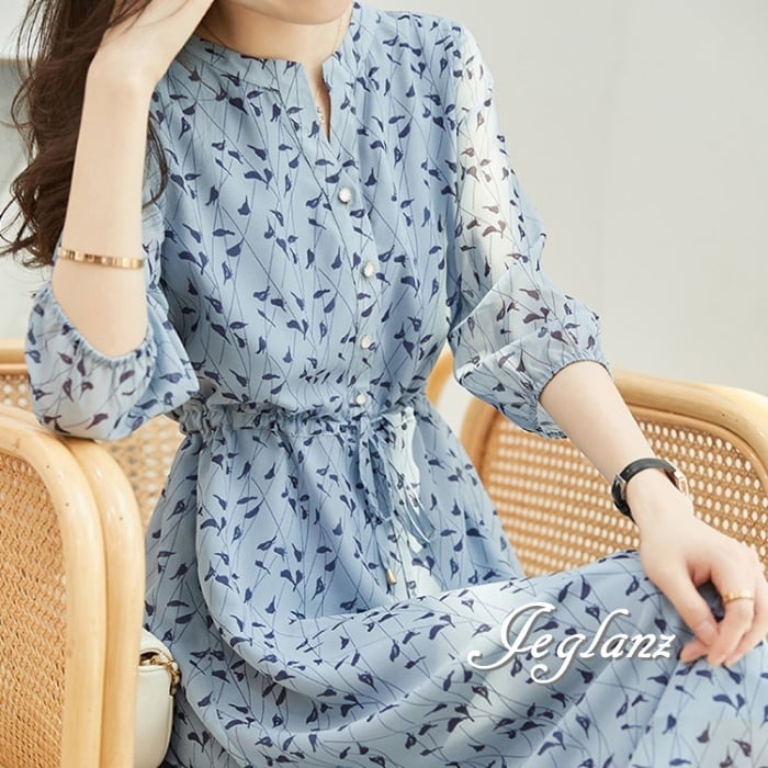 小鳥 プリント ワンピース ドロスト キーネック 透け感 7分袖 (M9024)α